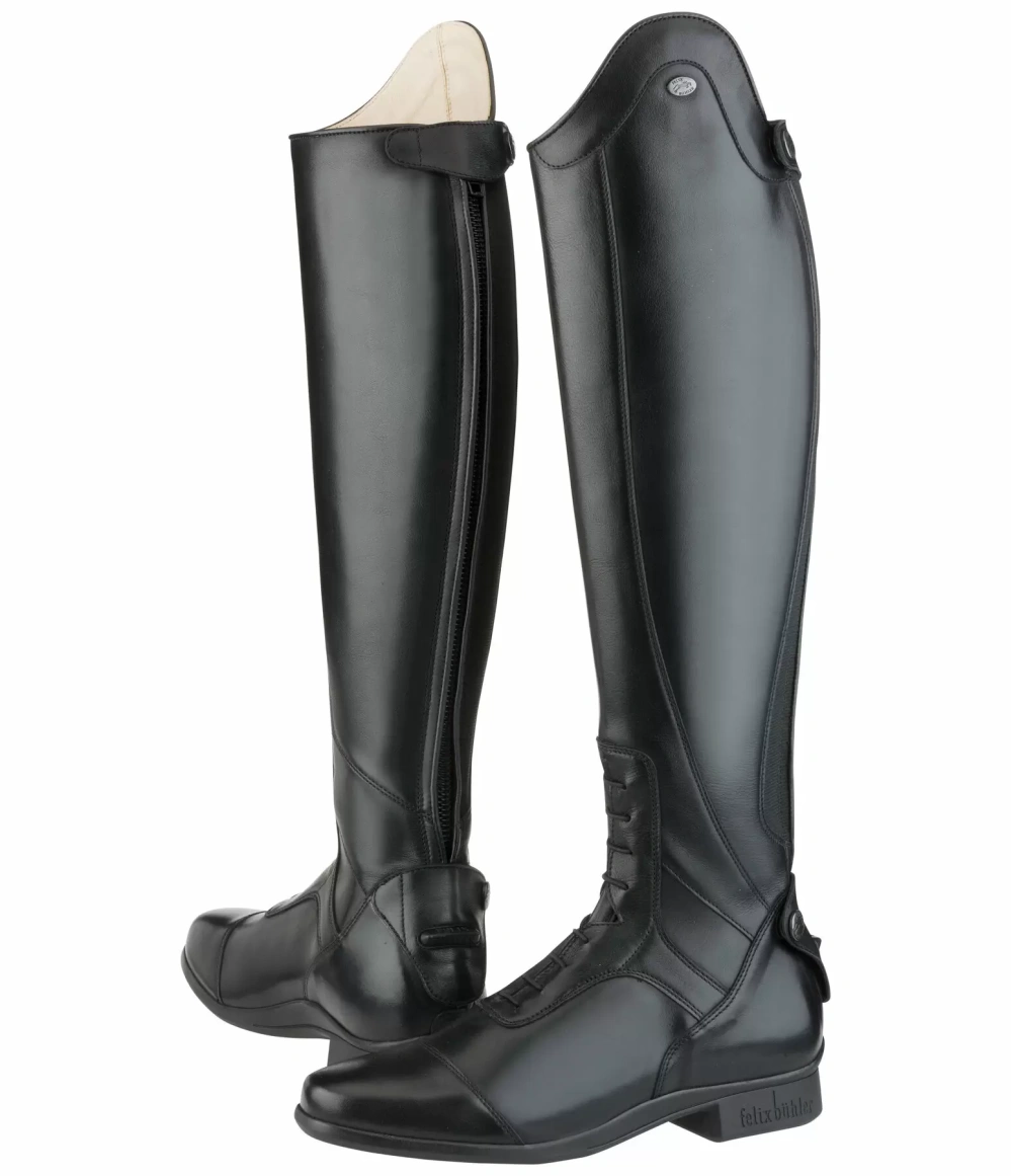 Buty sznurowane klasy premium wykonane z włoskiej skóry bydlęcej pełnoziarnistej, która jest przyjemnie miękka, a jednocześnie bardzo wytrzymała. Wewnętrzna wyściółka wykonana jest z miękkiej skóry świńskiej. Niezwykle wytrzymały zamek błyskawiczny z tyłu również gwarantuje długą żywotność. Smukłe linie w okolicy kostki, a także eleganckie przeszycia na cholewce nadają jeźdźcowi smukłą nogę. Elastyczne sznurowanie na podbiciu zapewnia niezbędną elastyczność dla niskiego obcasa. Obszar podeszwy ma smukły kwadratowy kształt i jest wyposażony w technologię Comfort Footbed, która składa się z wielowarstwowej wkładki i starannie zaprojektowanej podeszwy zewnętrznej, która jest przyszyta do cholewki buta. Kolejnym szczegółem jest zintegrowany uchwyt na ostrogi na osłonie ostrogi.
