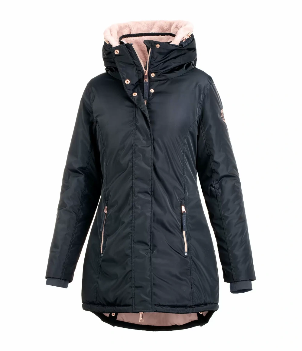Piękna, ciepła, funkcjonalna kurtka jeździecka z bardzo dużym kołnierzem podszytym miękkim pluszowym polarem i chowanym kapturem. Wodoodporny i odporny na wiatr. Ciepłe wypełnienie z imitacji puchu, ukryty dwukierunkowy zamek błyskawiczny z przodu, 2 przednie kieszenie na zamek, 1 wewnętrzna kieszeń na zamek, 2 tylne rozcięcia z zatrzaskami, elastyczna wstawka z tyłu i wysokiej jakości haft Felixa Bühlera na kołnierzu i rękawach. Mankiety z otworami na kciuki wykonane z elastycznego materiału.