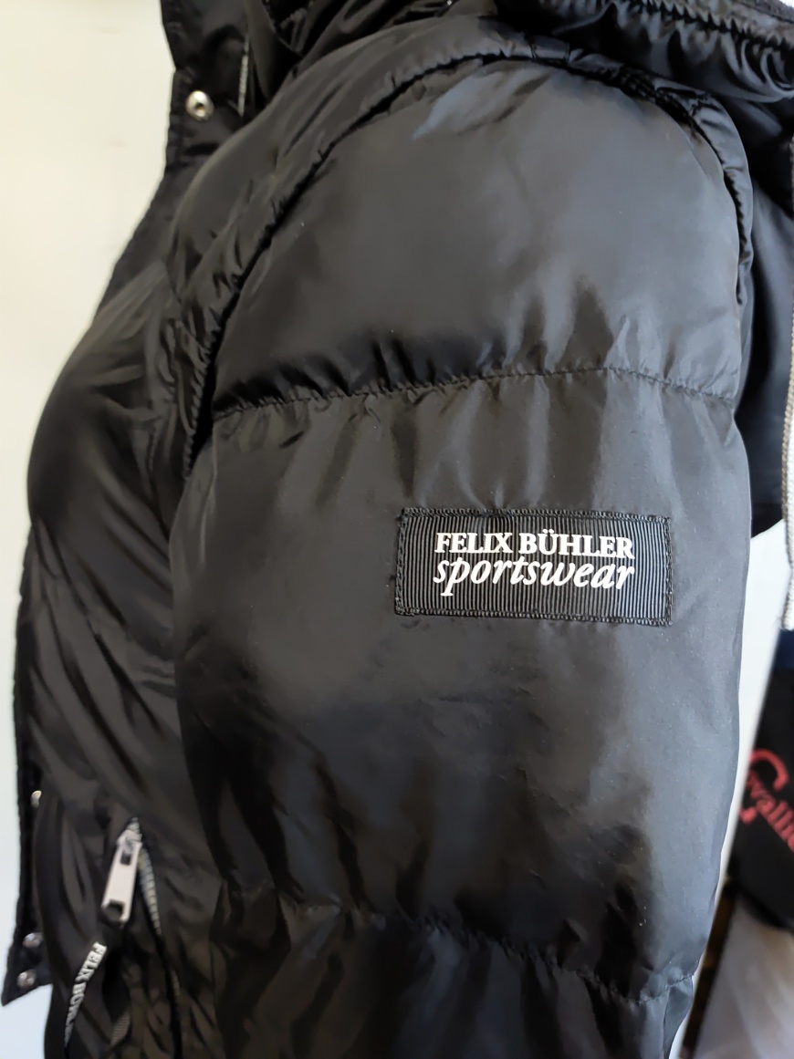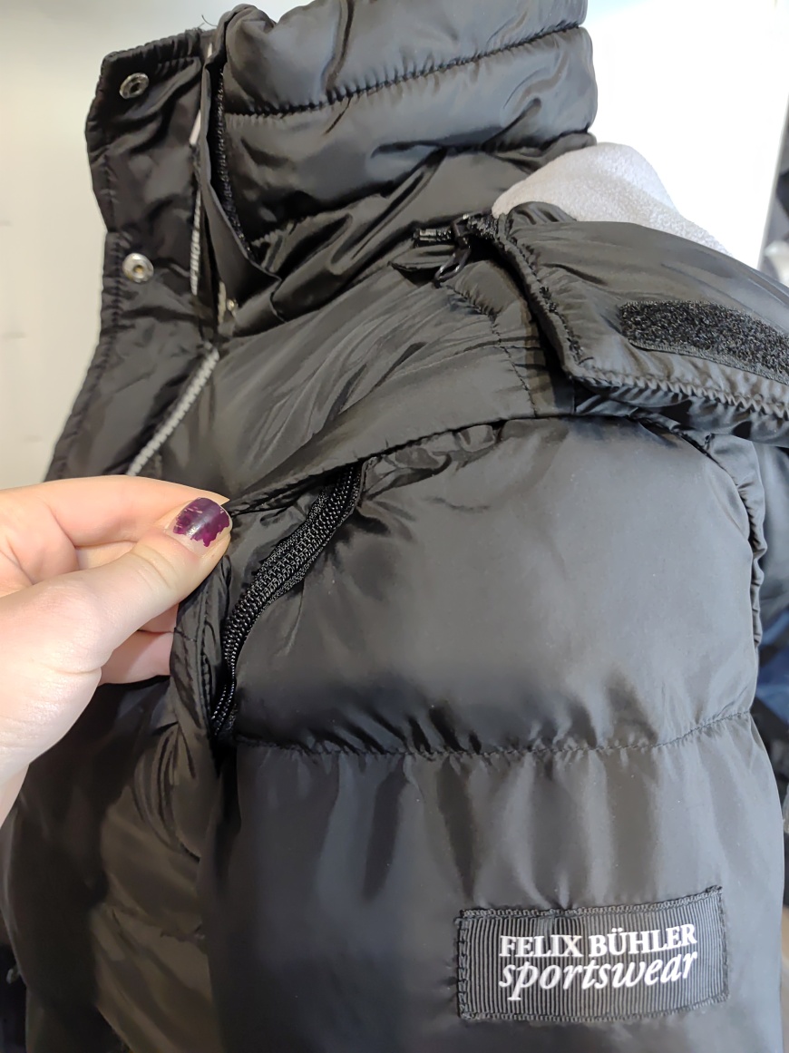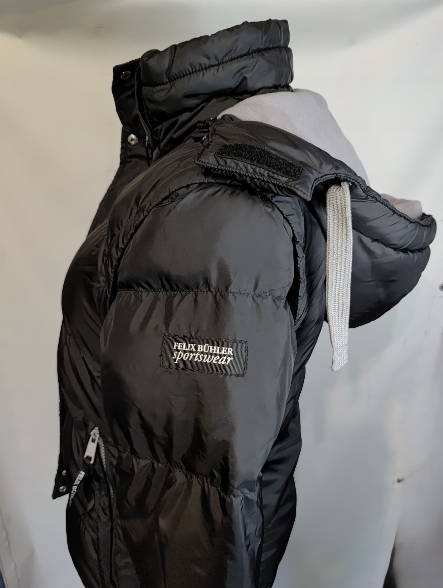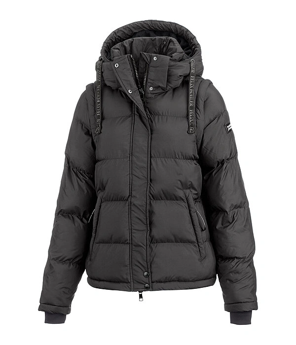 Kurtka i kamizelka w jednym: ciepła kurtka jeździecka z odpinanymi rękawami! Miękkie wypełnienie z puchu syntetycznego, wysoki kołnierz z regulowanym kapturem (podszytym polarem), który można również odpiąć lub zapiąć z tyłu. Ukryty dwukierunkowy zamek błyskawiczny z przodu, 2 ukryte zamki z przodu, kieszenie podszyte polarem i naszywka Felixa Bühlera na ramieniu. Miękkie ściągacze przy mankietach i ściągacz u dołu. 100% poliester.