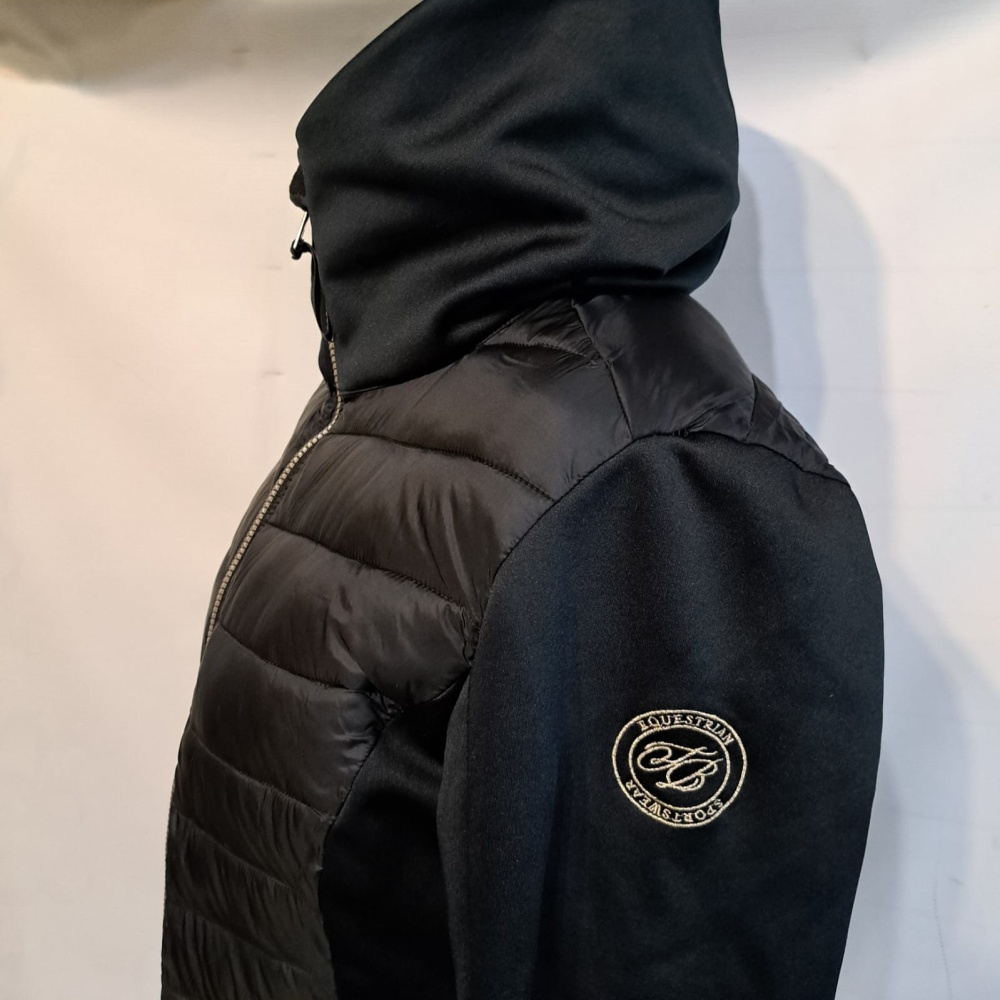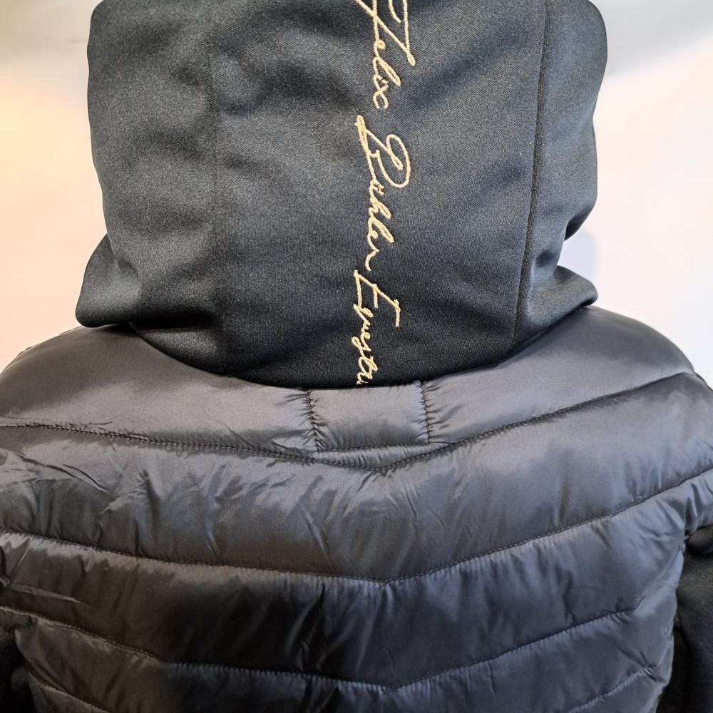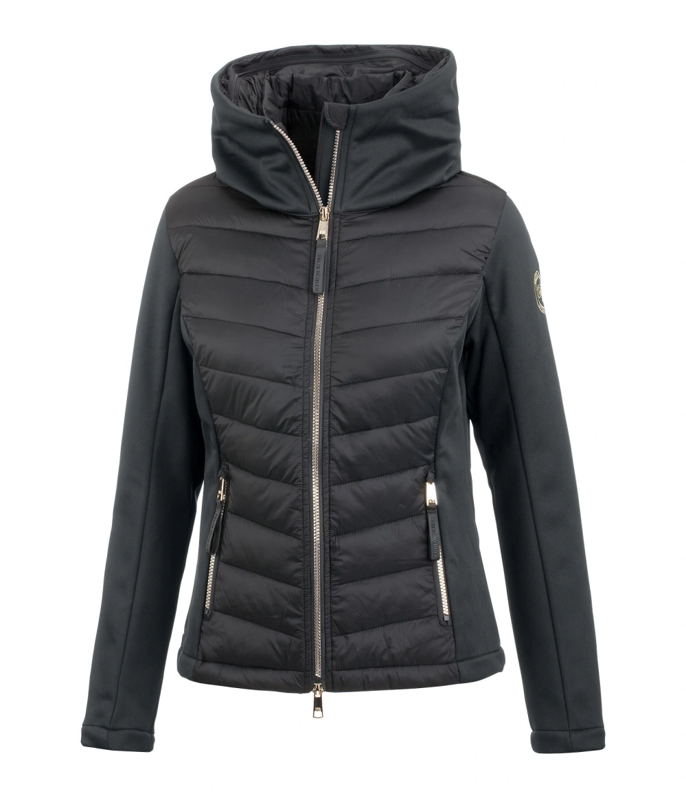 Niezwykle szykowna, wiatroszczelna kurtka jeździecka wykonana z miękkiego, połyskującego, pikowanego materiału z lekkim wypełnieniem ze sztucznego puchu oraz rękawami i bocznymi wstawkami z elastycznego softshellu. Podwójny kołnierz, chowany, pikowany kaptur w dużym zewnętrznym kołnierzu z zamkiem błyskawicznym i pięknym haftem. Błyszczący, podszyty dwukierunkowy zamek błyskawiczny z osłoną podbródka, 2 przednimi kieszeniami zapinanymi na zamek i haftem Felixa Bühlera na rękawie.