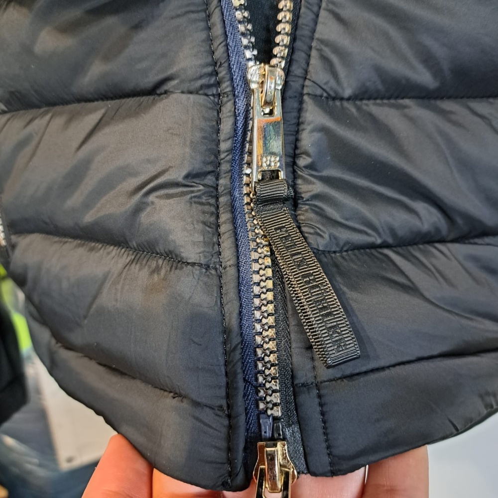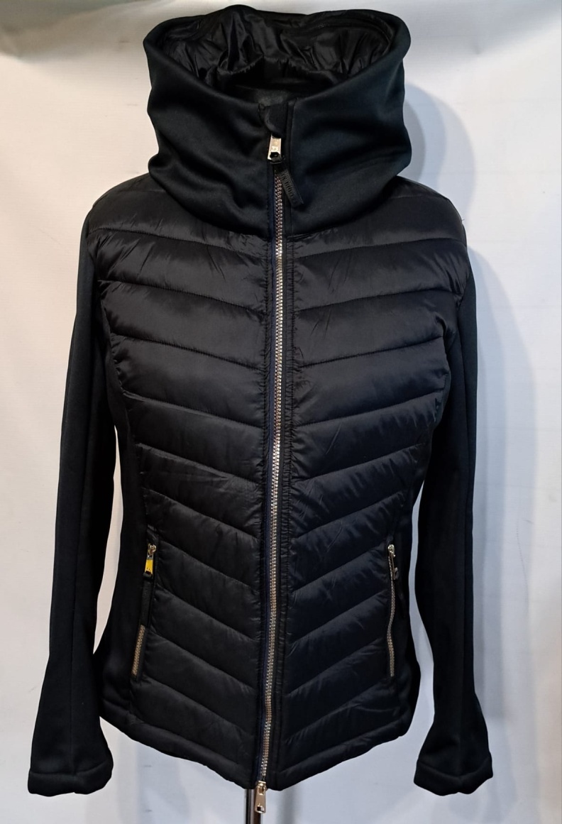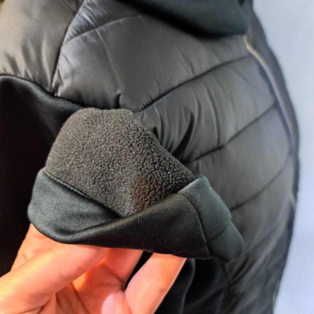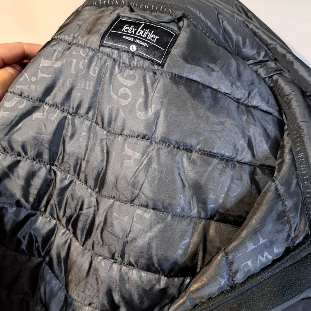 Niezwykle szykowna, wiatroszczelna kurtka jeździecka wykonana z miękkiego, połyskującego, pikowanego materiału z lekkim wypełnieniem ze sztucznego puchu oraz rękawami i bocznymi wstawkami z elastycznego softshellu. Podwójny kołnierz, chowany, pikowany kaptur w dużym zewnętrznym kołnierzu z zamkiem błyskawicznym i pięknym haftem. Błyszczący, podszyty dwukierunkowy zamek błyskawiczny z osłoną podbródka, 2 przednimi kieszeniami zapinanymi na zamek i haftem Felixa Bühlera na rękawie.
