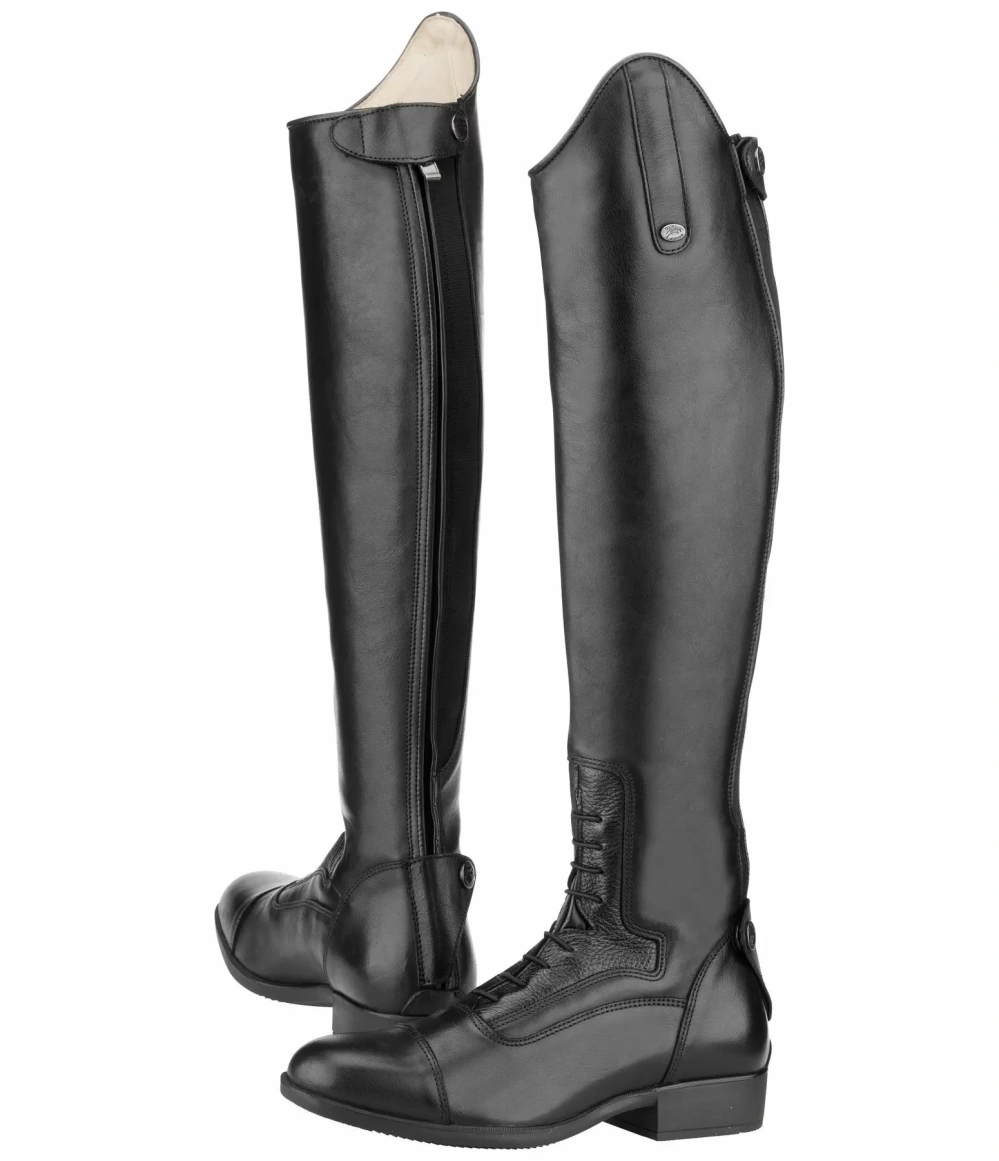 Eleganckie, sznurowane botki wykonane z niemieckiej skóry licowej bydlęcej. Wysokiej jakości skóra jest przyjemnie miękka, a jednocześnie bardzo trwała. Wewnętrzna wyściółka wykonana jest z miękkiej świńskiej skóry. Zamek OPTI z tyłu z elastyczną wstawką po jednej stronie umożliwia idealne dopasowanie do indywidualnego kształtu łydki. W obszarze sznurowania znajduje się skórzane wybrzuszenie, które podtrzymuje głęboką piętę w strzemieniu. Obszar stóp wykonany jest w smukłym kwadratowym kształcie. Dalsze szczegóły obejmują amortyzującą wkładkę z wyjmowaną wkładką, odporną na ścieranie gumową podeszwę i ochronę przed ostrogami.