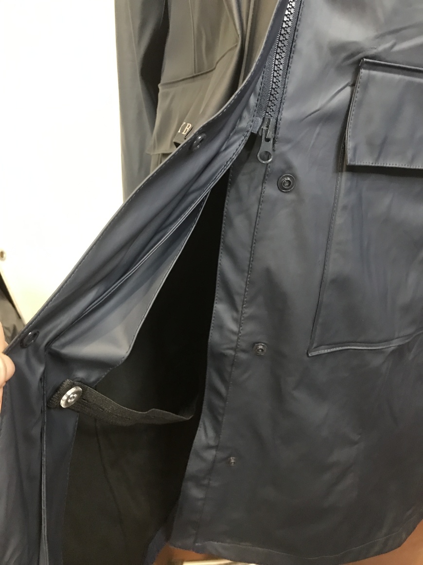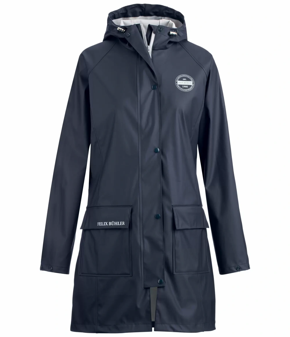 Długi płaszcz przeciwdeszczowy do jazdy konnej z kontrastową podszewką. Wodoodporny (5000 mm) i wiatroszczelny. Ukryty dwukierunkowy zamek błyskawiczny z przodu, 2 tylne otwory wentylacyjne zapinane na zatrzaski, 2 kieszenie z patkami, regulowany kaptur i szerokość rękawów, osłona podbródka, odblaskowe nadruki z przodu i z tyłu. Materiał: 100% poliuretan.