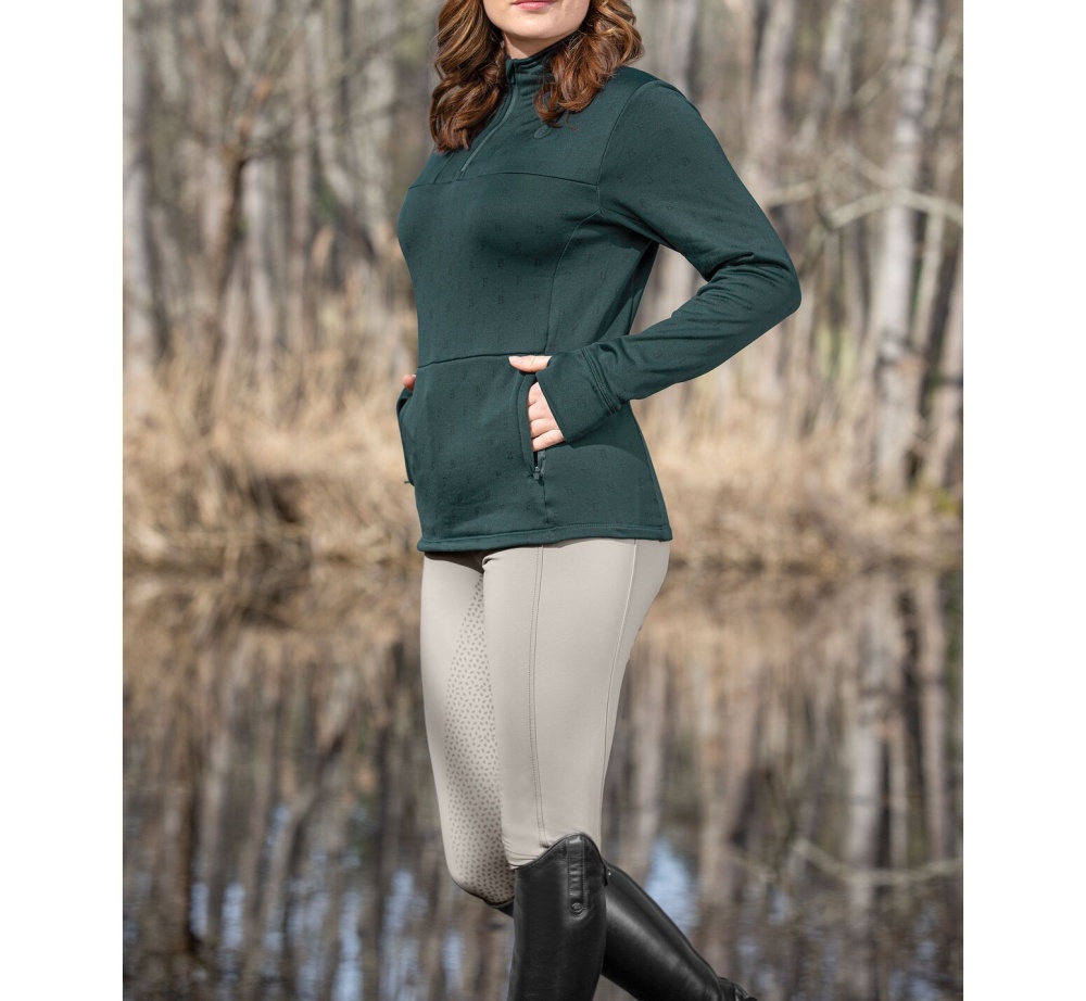Przytulna, ciepła i funkcjonalna koszula ze stójką i zamkiem błyskawicznym z osłoną podbródka. Oddychająca i szybkoschnąca. Kieszeń kangurka z zamkiem błyskawicznym z przodu, naszywki z logo na piersi i u dołu z tyłu, otwory na kciuki oraz subtelny nadruk z logo na całej powierzchni. Nieco dłuższy tył. 91% poliester, 9% elastan.