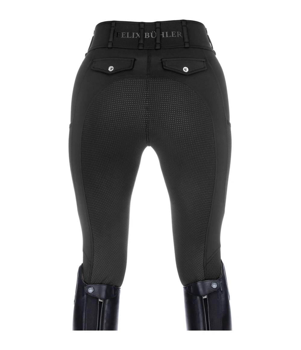 Niezwykle wygodne, przewiewne bryczesy z laserowo wycinanymi wstawkami na nogawkach. Najwyższej jakości, niezwykle elastyczny materiał rozciągliwy w czterech kierunkach zapewnia doskonały efekt modelowania. Silikonowy lej na całej długości, wysoce oddychający i szybkoschnący. Wygodny pas ze szlufkami i 2 napami. 2 boczne kieszenie na telefon komórkowy z laserowo wycinanymi lamówkami, 2 tylne imitacje kieszeni zapinane na guziki, bez szwów na kolanach, sportowe nadruki Felixa Bühlera. 78% poliester, 22% elastan.