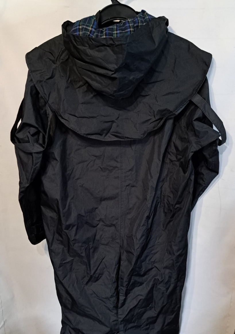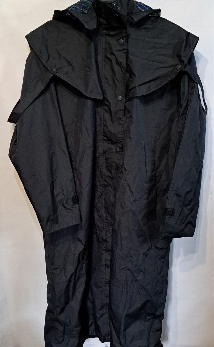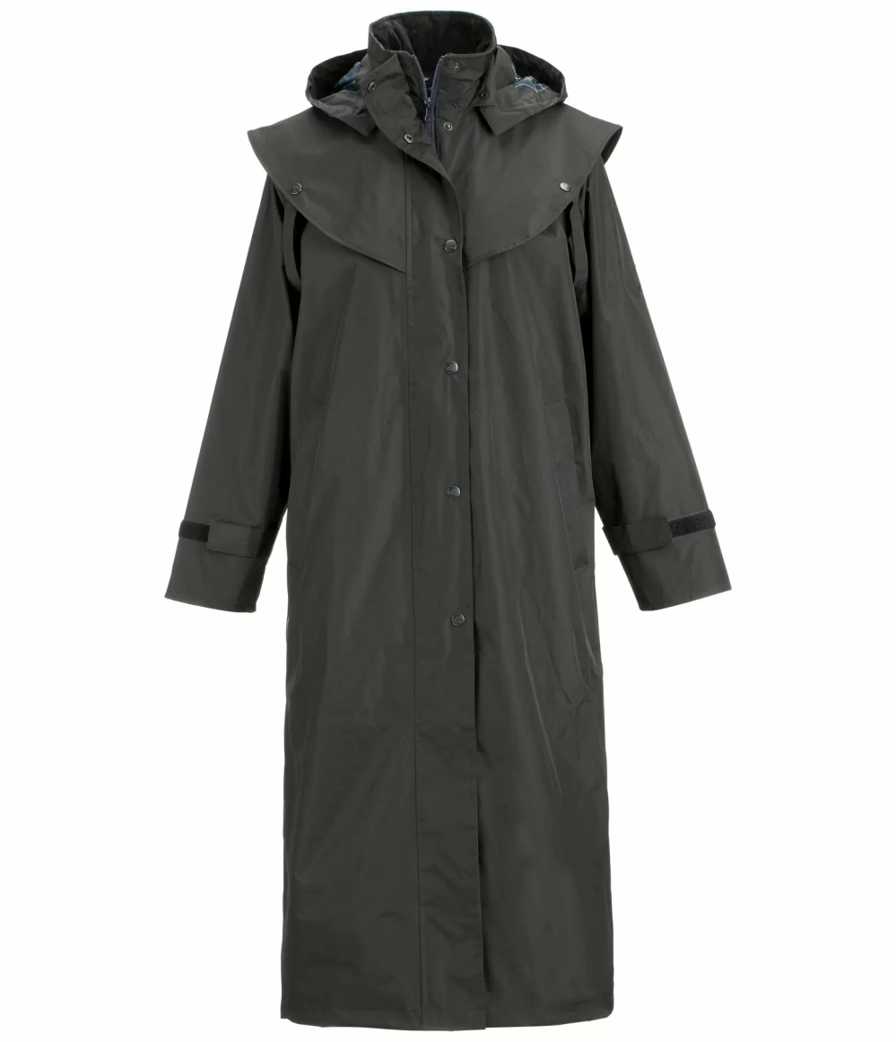 Klasyczny płaszcz przeciwdeszczowy z licznymi detalami zapewniającymi komfort i swobodę ruchów w siodle. Wodoodporny, wiatroszczelny, ze specjalnie klejonymi szwami. Bawełniana podszewka zapewnia wyjątkowo wygodne dopasowanie. Pętle na nogi do zapięcia. Odpinany kaptur ze ściągaczem ze sznurkiem, podszewka z sztruksu przy kołnierzu, ukryty dwukierunkowy zamek błyskawiczny z zatrzaskiem. Dwie kieszenie z przodu, wewnętrzna kieszeń na telefon komórkowy i pojemna kieszeń wewnętrzna. Zapięcia na rzepy przy mankietach i tylnym otworze wentylacyjnym. Dołączona peleryna na ramiona zapewnia dodatkową ochronę przed deszczem.