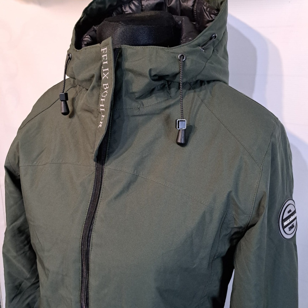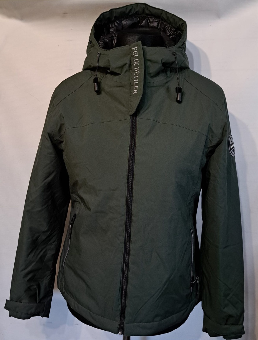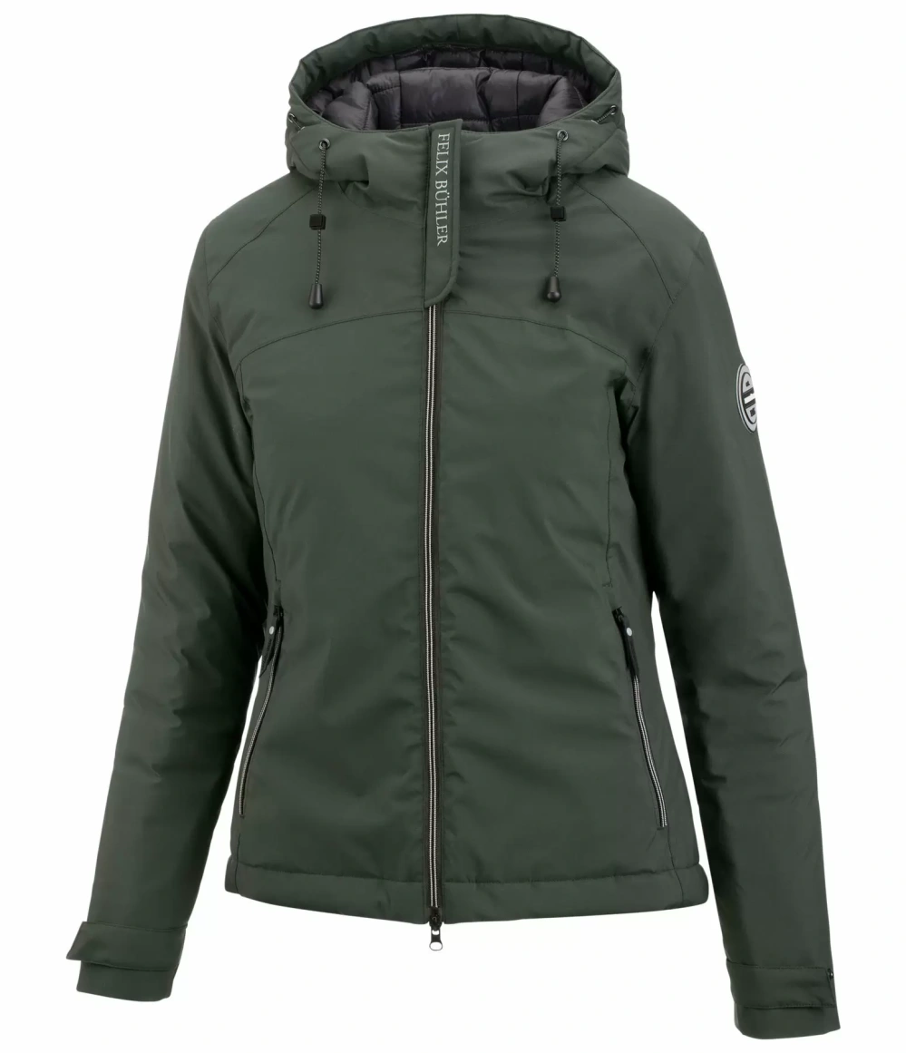 Funkcjonalna, sportowa krótka kurtka z ciepłym pikowaniem z imitacji puchu. Wiatroszczelna i oddychająca. 2 kieszenie na dłonie zapinane na zamek, podszyty zamek błyskawiczny z przodu, regulowana talia, regulowany kaptur, regulowane mankiety, naszywka Felixa Bühlera na rękawie.