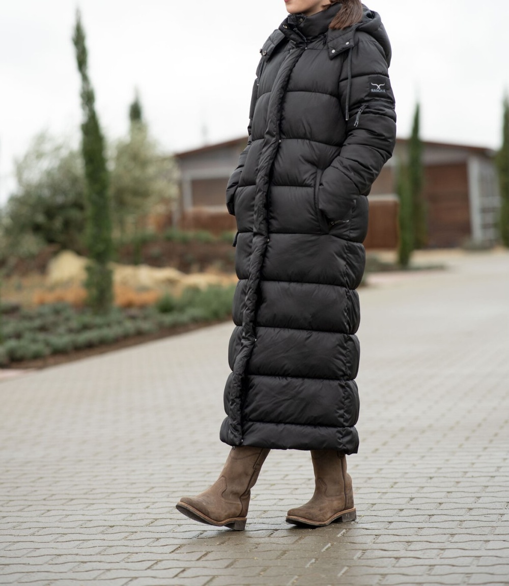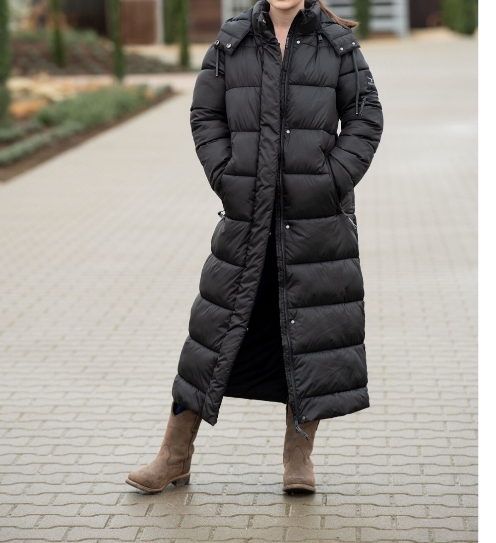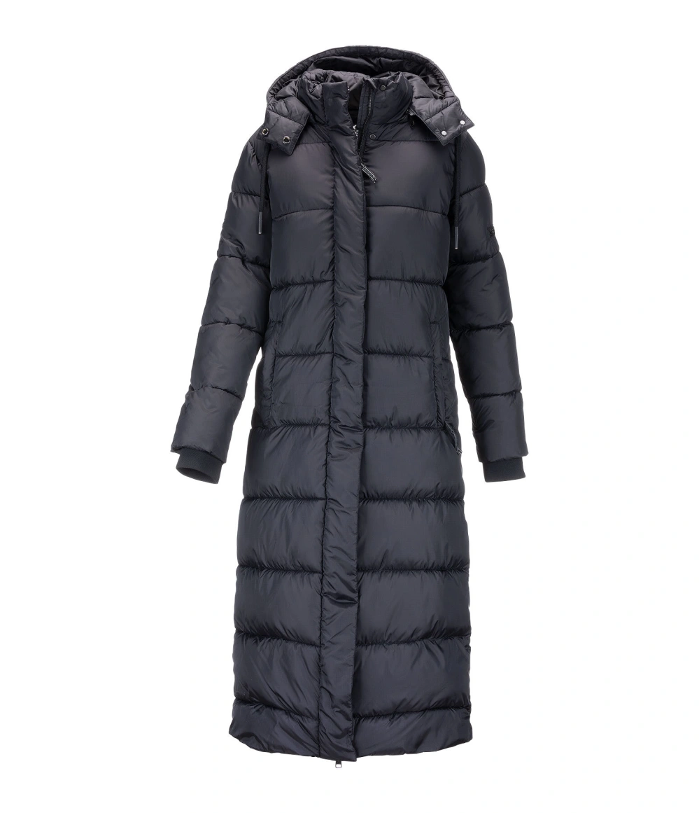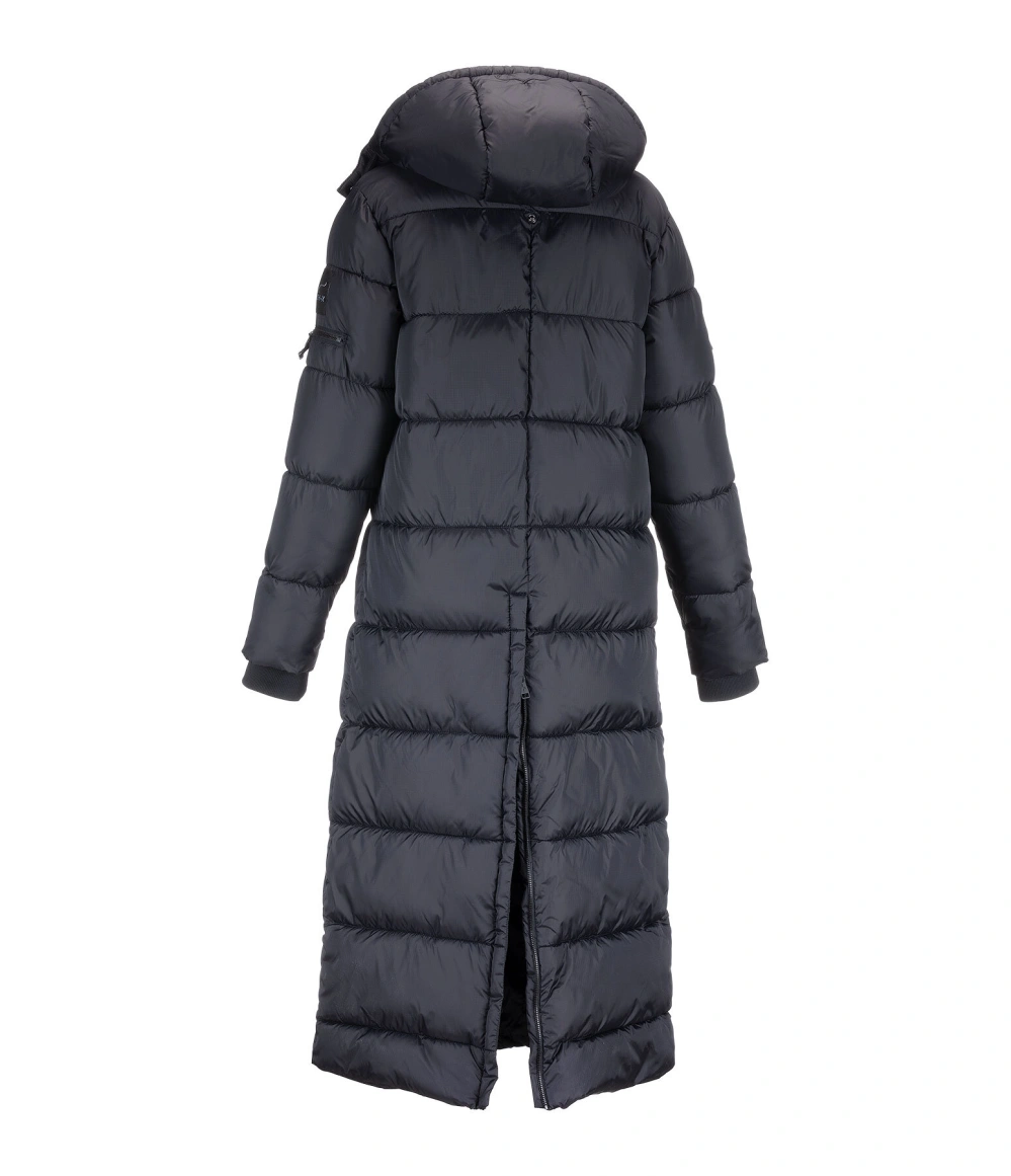 Bardzo długi, ciepły pikowany płaszcz z odpinanym i regulowanym kapturem, zapinanym na zatrzaski. Dwukierunkowy zamek błyskawiczny z przodu i praktyczne kieszenie zapinane na zamek z przodu, wewnątrz i na rękawie. Otwór wentylacyjny z ukrytym zamkiem błyskawicznym. Logo marki na rękawie i kapturze. Wiatroszczelny, wodoodporny i oddychający. 97% poliester, 3% nylon.