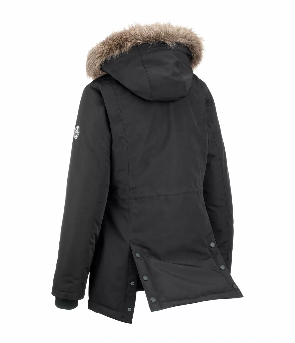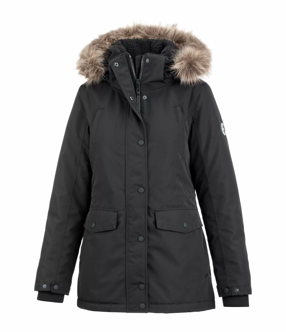 Wysokiej jakości, funkcjonalna, damska kurtka jeździecka o dłuższym kroju i stylowym wyglądzie. Wodoodporny (5000 mm), wiatroszczelny i oddychający. Odpinany i regulowany kaptur z odpinanym kołnierzem ze sztucznego futra. Wypełnienie ze sztucznego puchu, regulowane mankiety z elastycznymi mankietami, 2 kieszenie zapinane na zamek, 1 kieszeń na piersi zapinana na zamek, kryty dwukierunkowy zamek z przodu, 2 rozcięcia z tyłu zapinane na zatrzaski, kaptur z możliwością zapięcia z tyłu. Naszywka Felixa Bühlera na rękawie, wewnętrznym kołnierzu i kapturze podszytym polarem.